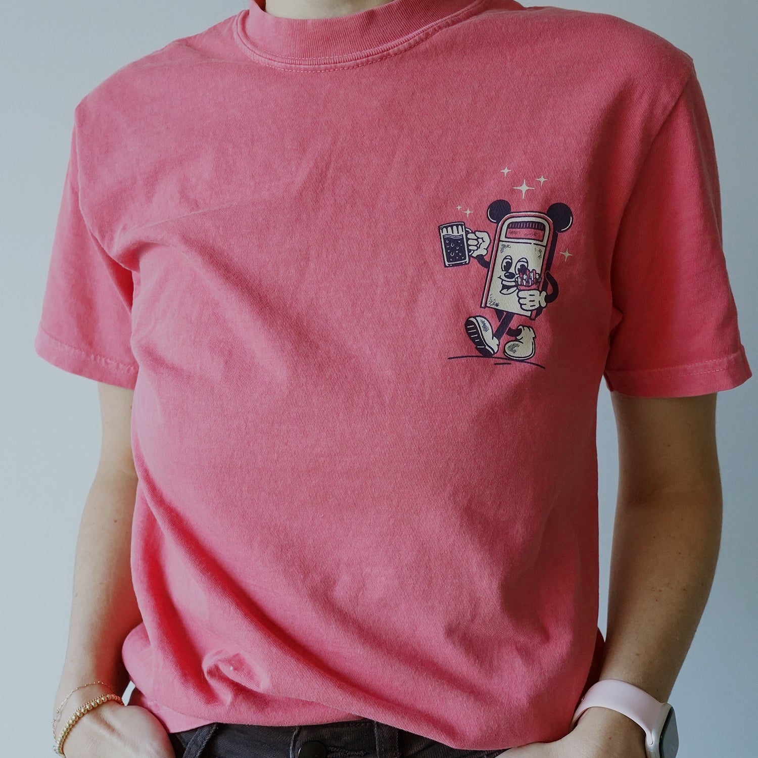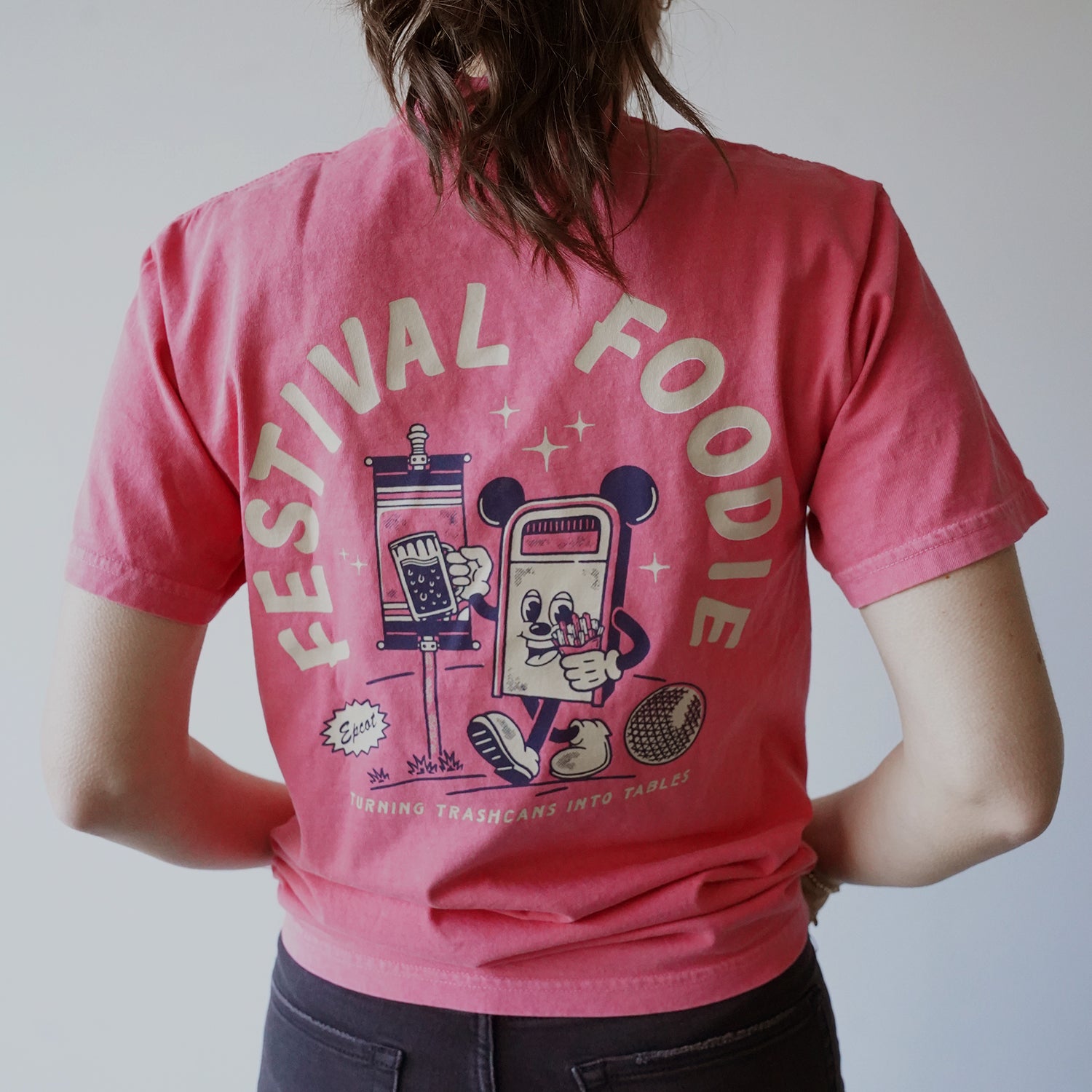 At its core, this design celebrates one of Epcot’s most iconic cultural details: the unspoken art of balancing your food and drink on a trashcan. It’s a subtle, tongue-in-cheek reference that true festival fans instantly recognize. Designed to look like something you’d pick up at an art fair or creative market, this Disney-inspired tee blends park culture with everyday wearability.