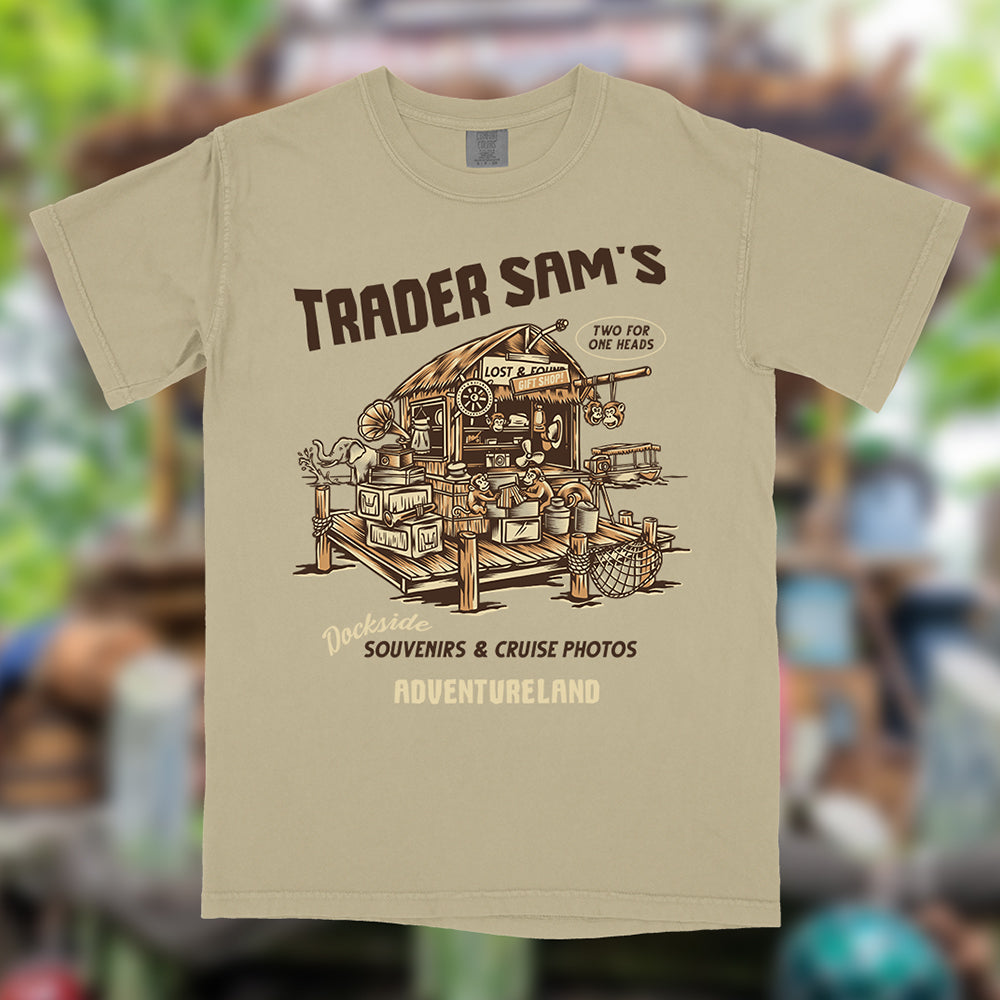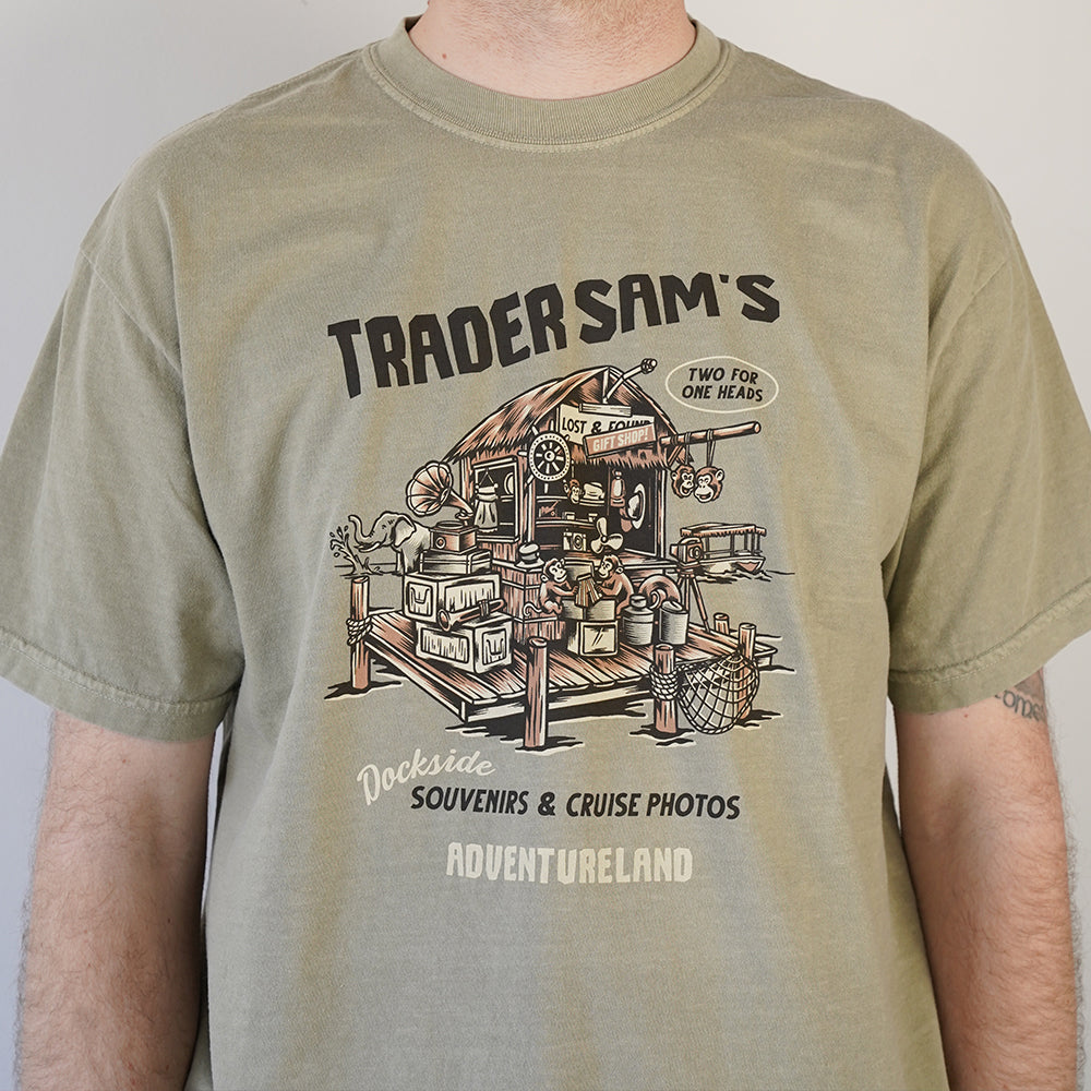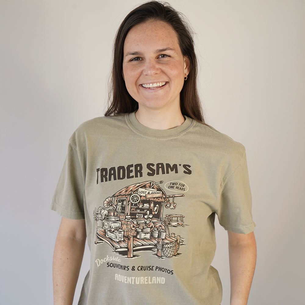 Printed on garment-dyed Comfort Colors for a soft, broken-in feel, the Trader Sam’s tee is made for long park days, Adventureland strolls, and everyday wear long after your last cruise.